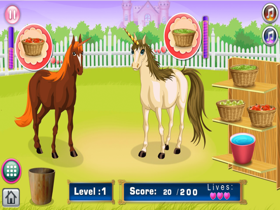 The unicorns and horses at the stable require food, water, and care to keep them healthy. The player is tasked to provide what they need according to the image that pops up. They need to fulfill the request before the bar decreases to earn points. Keep them happy by giving them their basic needs at the right time. Keep the hearts full to ensure that they are well-fed and hydrated.